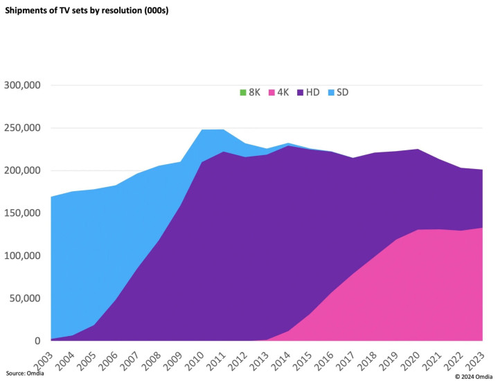 Omdia2024年的数据表明,需求正在转向4K电视。